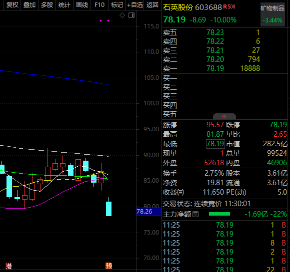 石英股份开盘大跌,9点40分即触及跌停,10点前即封死跌停板。截至上午收盘,该股报78.19元,下跌10%,封单超1.8万手。