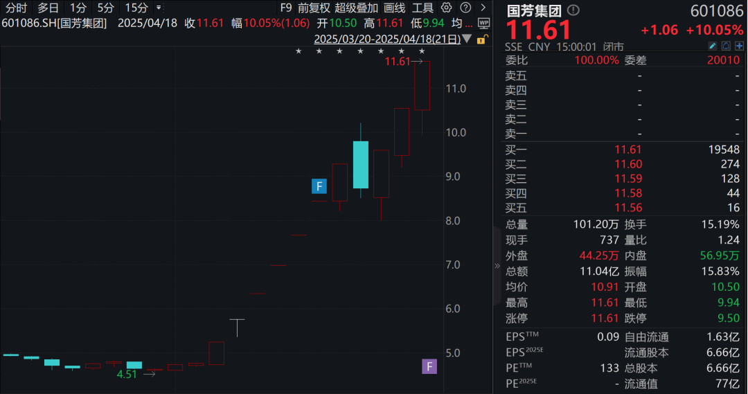 个股方面,国芳集团今天再次涨停,实现11天10板。