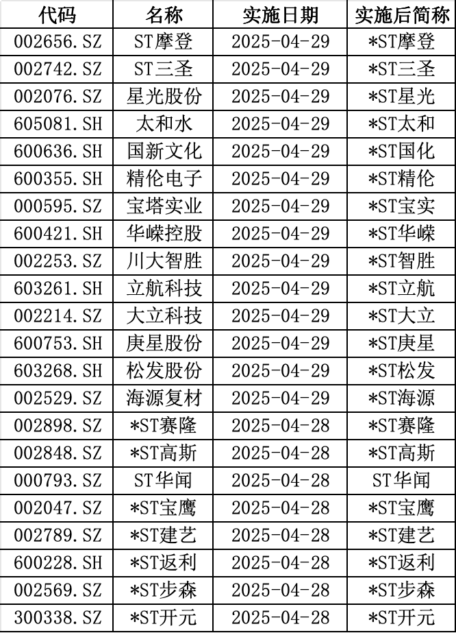 ST股的队伍还在持续扩容。根据Wind统计,4月29日还将有星光股份、太和水等十余只个股被实施ST。其中,ST摩登、ST三圣将“披星”,成为*ST摩登、*ST三圣;星光股份、国新文化等将“披星戴帽”,变成*ST星光、*ST国化。