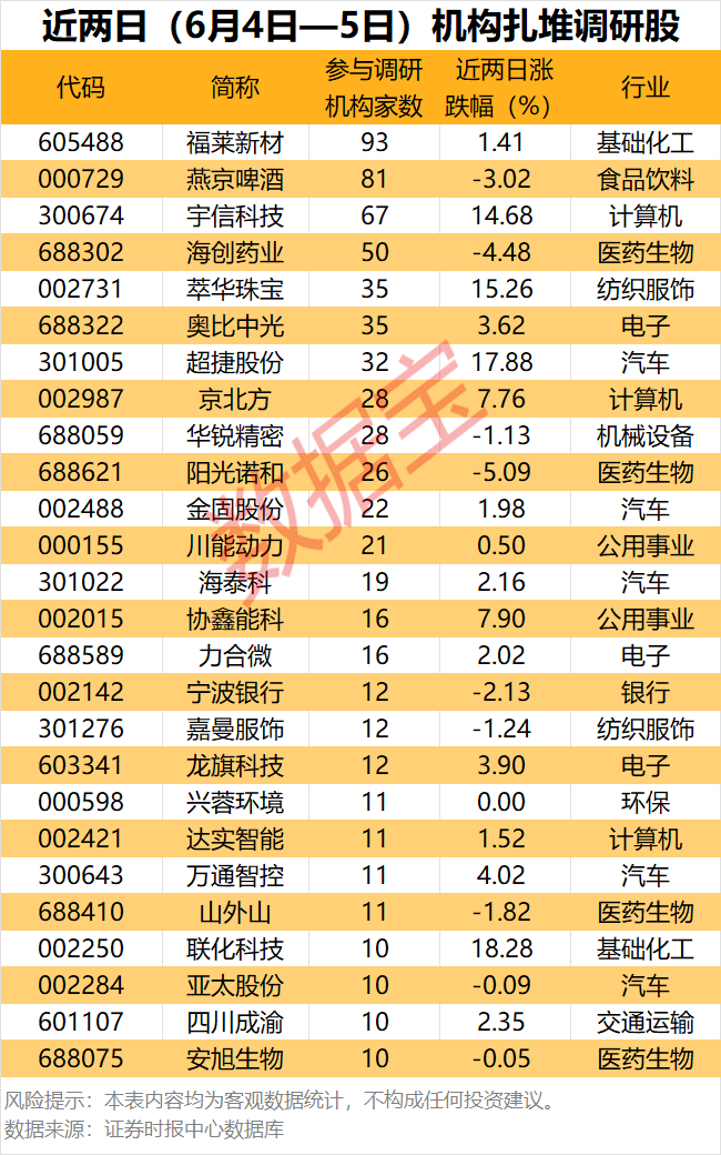 参与调研机构家数最多的是福莱新材,共有93家机构调研,其次是燕京啤酒,81家机构参与调研,宇信科技、海创药业也均有50家及以上机构调研。