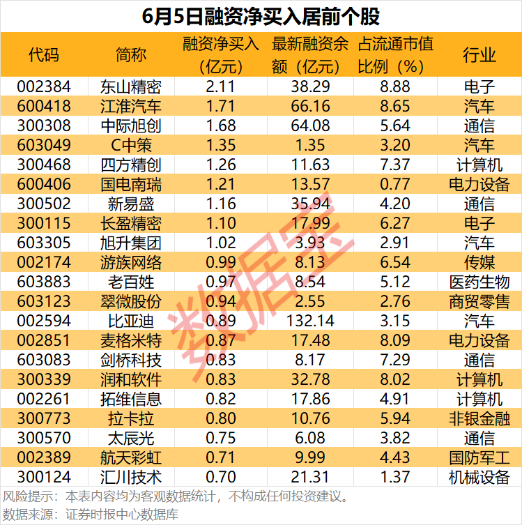 具体到个股,6月5日获融资净买入千万元以上的有407只,其中41只融资净买入额超5000万元。东山精密融资净买入额居首,当日净买入2.11亿元,其次是江淮汽车、中际旭创,融资净买入金额分别为1.71亿元、1.68亿元,融资净买入金额居前的还有C中策、四方精创、国电南瑞等。