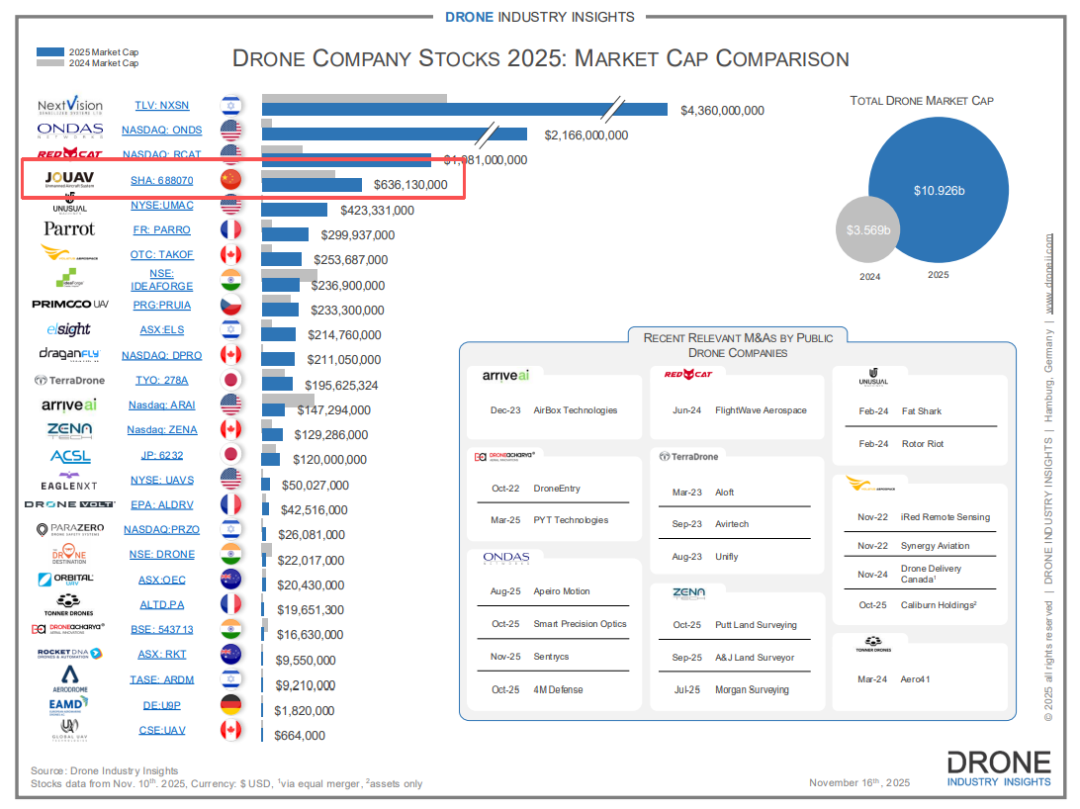近日,纵横股份(688070)官微消息显示,国际权威无人机行业研究机构德国Drone Industry Insights(Droneii)于近期发布了2025年度全球无人机上市公司市值排名。纵横股份成功跻身全球无人机上市公司市值排名TOP4,为此次榜单中唯一上榜的中国企业。