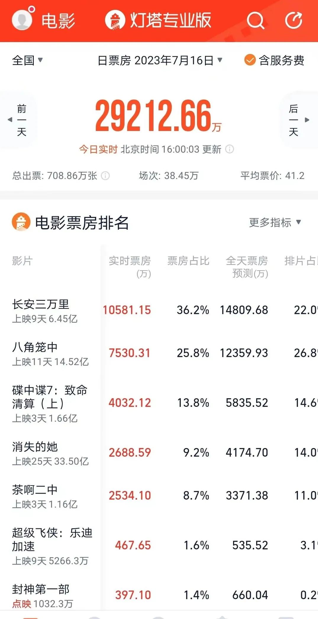 根据灯塔专业版数据,截至7月16日16:00,《长安三万里》的日票房占比为36.2%,达10581.15万元,而前一日该片的单日票房为11725.64万元,9天的总票房达6.45亿元,打破了过去三年暑期档动画片档期票房纪录。