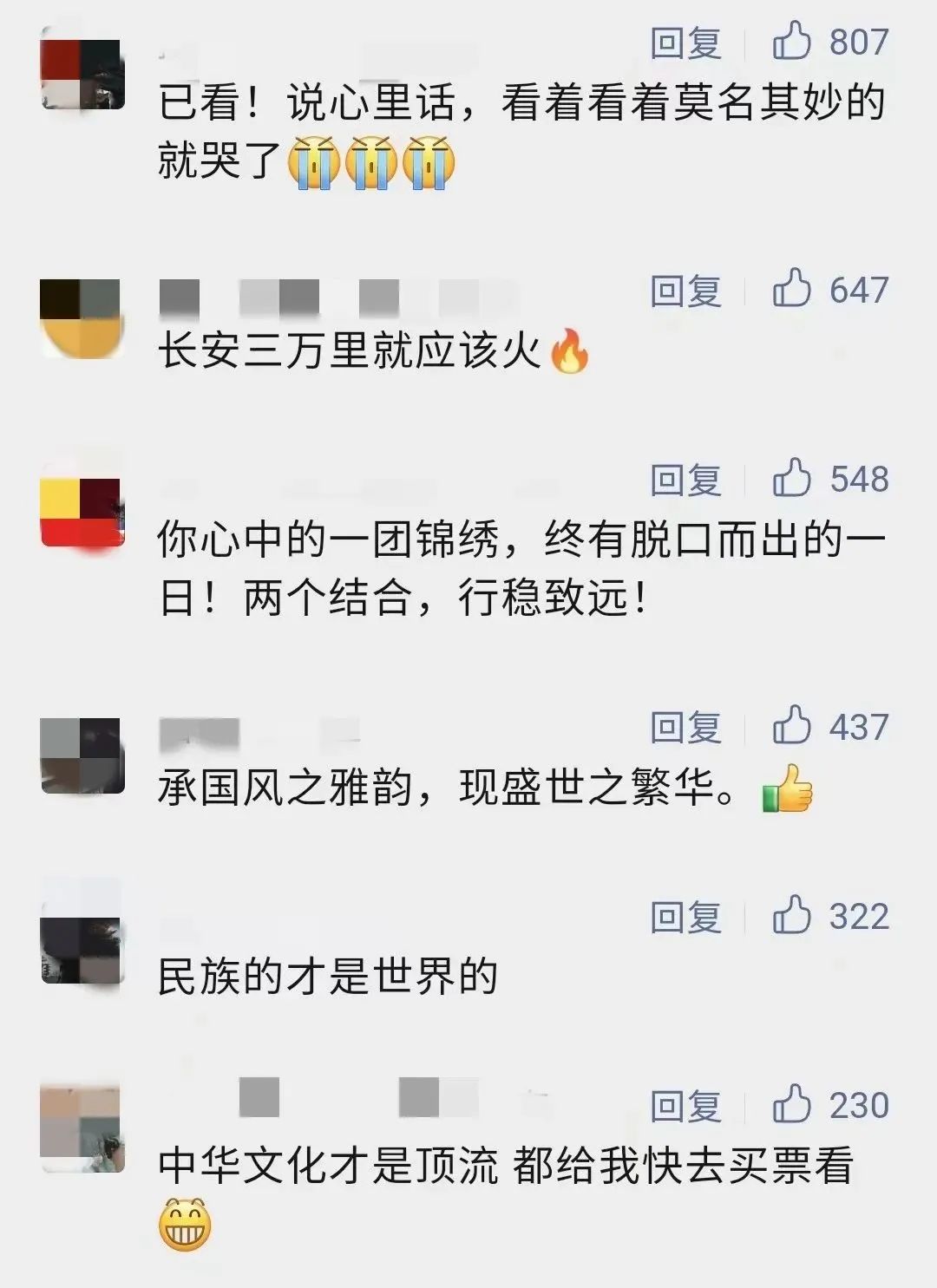观众对《长安三万里》的认可,在一篇《〈长安三万里〉为什么火了?》报道的微信留言区可见一斑:“已看!说心里话,看着看着莫名其妙的就哭了”“长安三万里就应该火”“你心中的一团锦绣,终有脱口而出的一日!两个结合,行稳致远!”“承国风之雅韵,现盛世之繁华。”“民族的才是世界的”……甚至还有人呼吁,让大家赶快去买票观看。