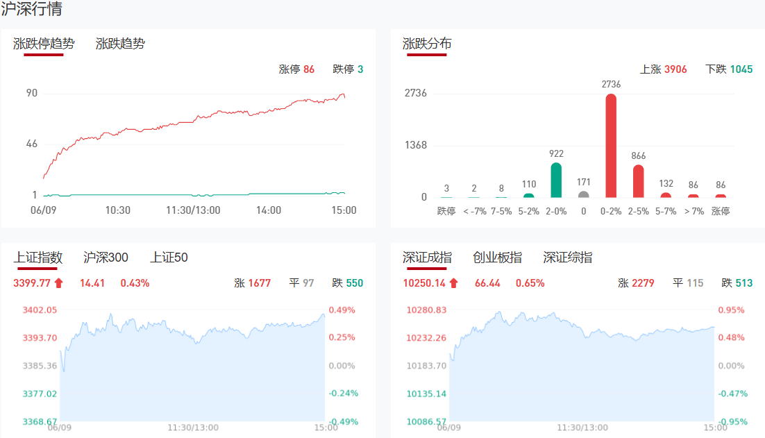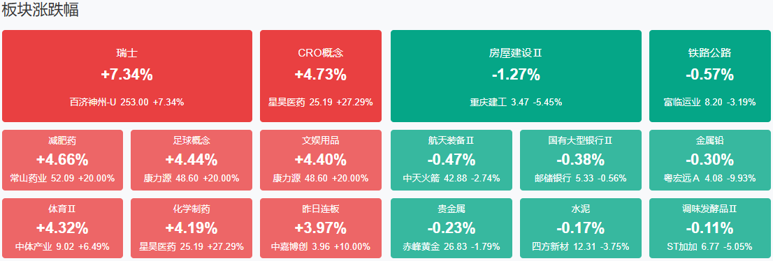 板块方面,创新药、足球概念、稀土永磁、可控核聚变等板块涨幅居前,贵金属等少数板块下跌。截至收盘,沪指涨0.43%,深成指涨0.65%,创业板指涨1.07%。