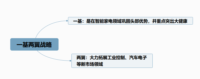 上,正积极开拓新能源汽车电子、工业控制等应用领域,聚焦高端市场。“一基”是在智能家电领域巩固头部优势,并重点突出大健康;“两翼”是大力拓展工业控制、汽车电子