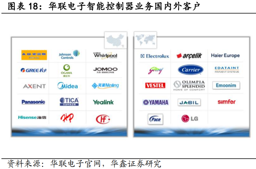 公司智能控制器积极布局高端市场,供货国内外知名客户。子公司华联电子涉及的智能控制器下游领域涉及家居、商用、汽车电子等市场,目前公司已经进入伊莱克斯、江森自控、艾欧史密斯、Arcelik A.S.、格力电器等众多知名厂商的供应体系。