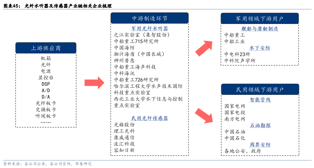 产业链来看,我国光纤水听器产业链分为上游零部件供应、中游制造以及下游应用三个环节。其中上游的零部件主要包括组成水听器的机箱、光纤、数据传输、转换分析芯片、电源等,供应商较为分散。中游制造商主要分为军用和民用两个领域,其中军用参与主体多为有军工背景的企业或体制内科研院所和单位,民用参与主体较多。下游军用领域用户多为舰船、潜艇以及水下安防主体单位,用户集中在中国船舶体系的中船重工和中船工业下属造船厂,民用领域用户较为分散,在智能管线、石油勘探、周界安防领域均有不同用户。