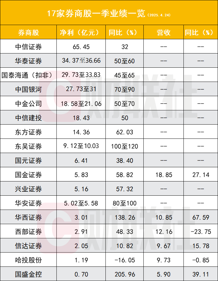 截至4月24日,6家券商股披露了2025年第一季度财报,结合前期已发布的业绩预报与快报,总计已有17家券商股公布一季度经营成果。