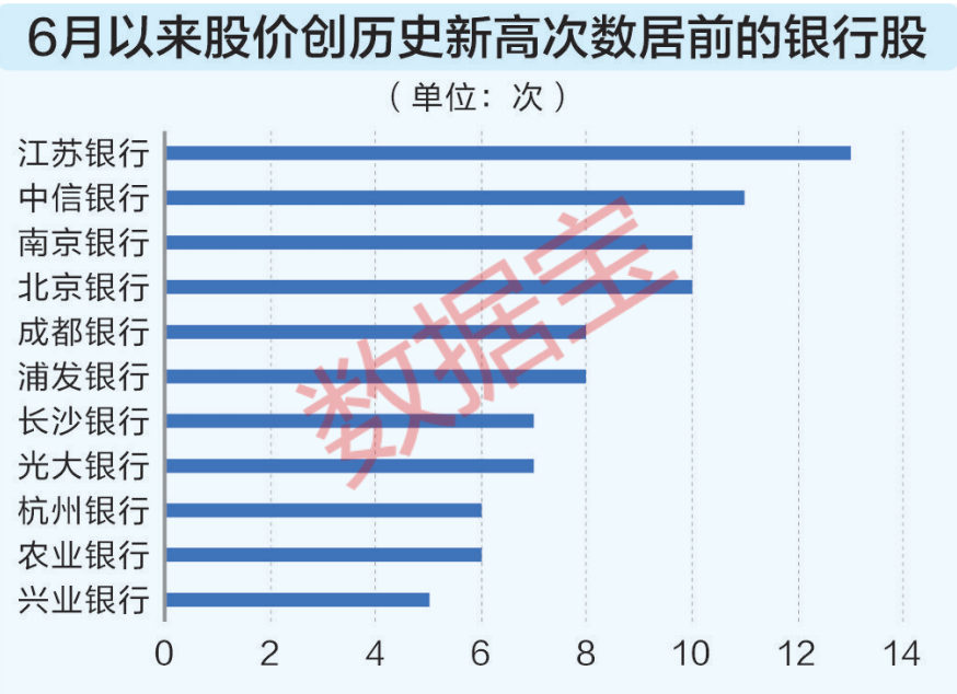 据数据宝统计,6月以来共有19只银行股股价突破历史新高,占总数的比例达到45.24%。其中,江苏银行在17个交易日内13次创历史新高居首;其他还有中信银行、南京银行、北京银行等,分别创下11次、10次、10次历史新高。