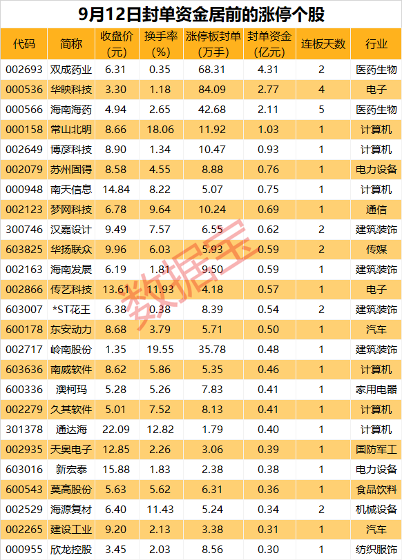以封单金额计算,4股封单资金超亿元,双成药业、华映科技、海南海药封单资金居前,分别为4.31亿元、2.77亿元、2.11亿元。