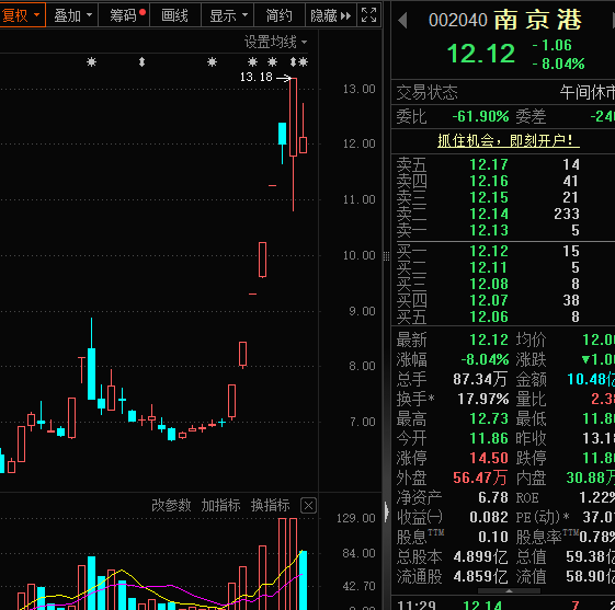 这一幕,无疑让众多投资者热血沸腾,纷纷憧憬其后续的行情走势。然而,今天的市场却风云突变,给投资者们浇了一盆冷水。南京港今日开盘跌停,大量卖单蜂拥而至,集合竞价成交6.7万手。此后,该股成交仍较为活跃,该股上午换手率近18%,下跌8.04%。