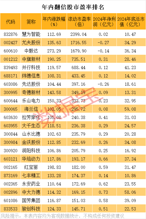 年内84只翻倍股!最高市盈率2399倍(附名单)