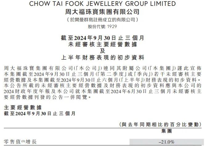 周大福珠宝集团10月22日发布的公告显示,截至2024年9月30日止三个月(2024年7月1日至9月30日,即其2025财年第二季度),其零售值比去年同期下降21%;分产品来看,报告期内,黄金首饰及产品的零售值贡献约81.4%,珠宝镶嵌、铂金及K金首饰的零售值贡献约为14.4%。报告期内,周大福珠宝集团于中国内地净关闭145个周大福珠宝零售点。