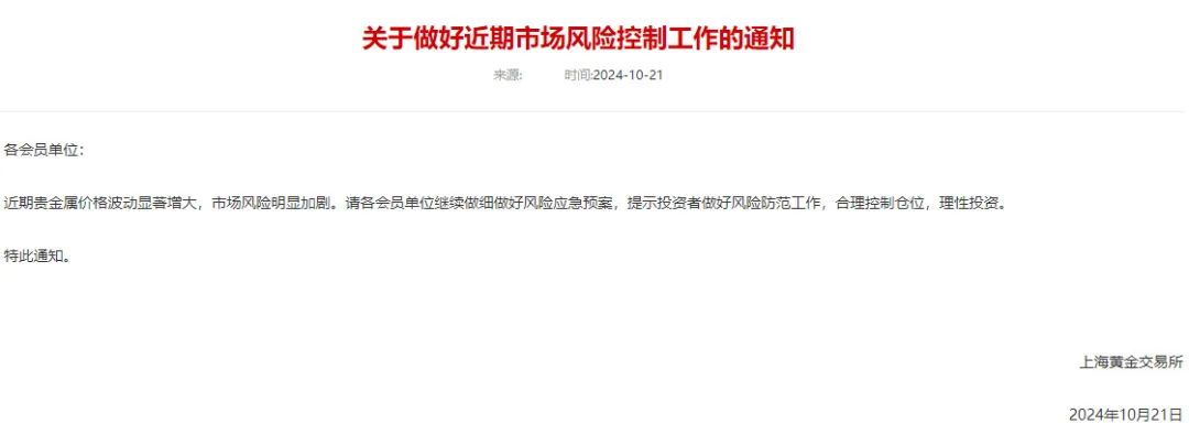 10月21日,上海黄金交易所发布关于做好近期市场风险控制工作的通知称,近期贵金属价格波动显著增大,市场风险明显加剧,请各会员单位继续做细做好风险应急预案,提示投资者做好风险防范工作,合理控制仓位,理性投资。