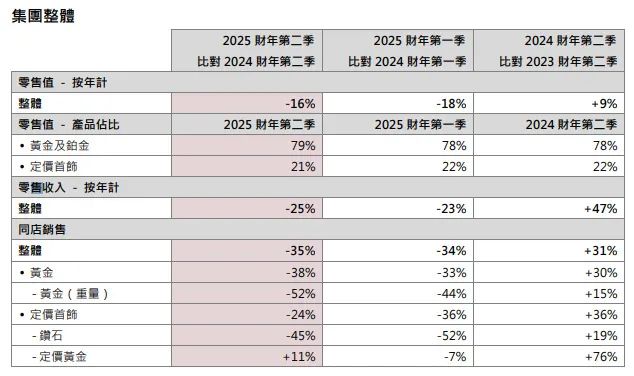 六福集团10月17日发布的截至2025年3月31日止财政年度第二季度(2024年7月1日至9月30日,即其2025财年第二季度)显示,报告期内,集团第二季度整体零售值按年下跌16%,主要受高基数效应及金价屡创新高影响;集团整体零售值中,黄金及铂金产品占比为79%,定价首饰占比为21%。截至2024年9月30日,六福集团集团在全球共有3408间店铺,在2025财年第二季度净减少76间店铺。