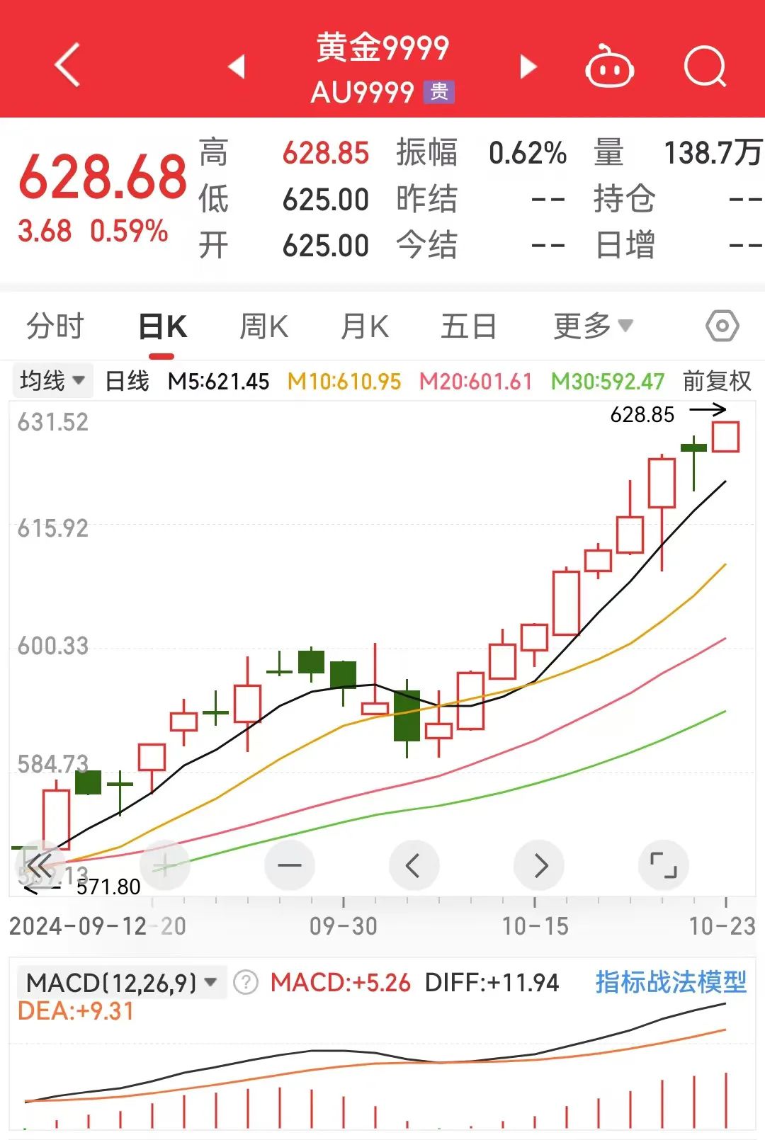 北京时间10月23日,国际国内金价再度刷新历史纪录。同花顺数据显示,截至当日17时,伦敦现货黄金盘中最高价超2758美元/盎司,COMEX黄金期货盘中最高价超2772美元/盎司;国内金价方面,截至当日收盘,上海黄金交易所Au9999盘中最高达628.85元/克,沪金主力连续合约盘中最高达630.44元/克。