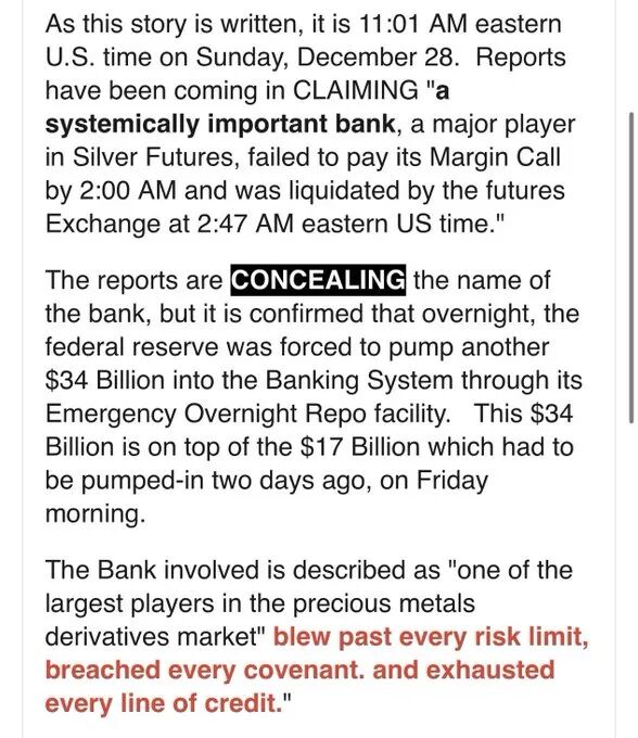 本周伊始,一张惊人的截图在X平台以每小时数百条的传播速度在投资圈内中疯传,其宣称的骇人内容——一家“系统重要性”银行白银爆仓濒临破产、交易所深夜强制平仓、美联储据称被迫向系统注入数十亿美元资金,挑动着每一根金融敏感神经。