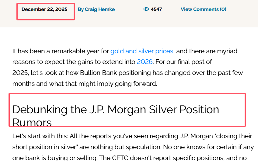 而从过去一个月的媒体报道和社交平台信息看,类似摩根大通“平仓白银空头头寸”的说法,其实早在12月初就有了——一直到上周也依然有坊间的信奉者。
