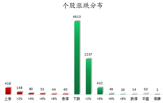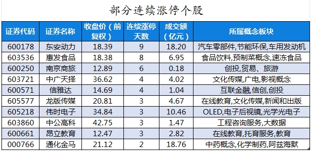 截至收盘,沪深两市合计418个股上涨,4613只个股下跌,平盘个股50只,停牌的个股2只。不含当日上市新股,共有40只个股涨停,14只个股跌停。连续涨停天数看,连续涨停天数超过2天的个股有16只。其中,东安动力已连收9个涨停板,连续涨停板数量最多。