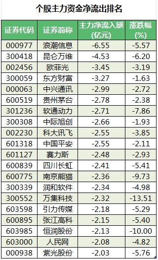 此外,3616只个股被主力资金净卖出,其中,73股被主力资金净卖出超1亿元。主力资金净流出最多的个股是浪潮信息,净流出金额为6.55亿元;主力资金净流出居前的个股还有昆仑万维、欧菲光、东方财富、中兴通讯、贵州茅台,净流出金额分别为4.53亿元、3.45亿元、3.27亿元、2.99亿元、2.78亿元。