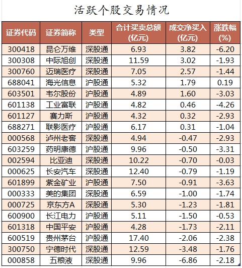 活跃个股方面,北向资金今日净买入较多的有昆仑万维、中际旭创、迈瑞医疗、海光信息、韦尔股份,净买入金额分别为3.82亿元、3.02亿元、2.57亿元、1.79亿元、1.6亿元。北向资金净卖出较多的有五粮液、宁德时代、贵州茅台、中国平安、长江电力,净卖出金额分别为6.86亿元、3.48亿元、2.06亿元、1.73亿元、1.5亿元。