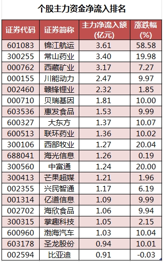 个股来看,今日有1460个股获主力资金净流入,其中,18股获主力资金净流入超1亿元。锦江航运获主力资金净流入最多,净流入金额为3.61亿元;主力资金净流入居前的个股还有常山药业、西藏矿业、川能动力、赣锋锂业、贝瑞基因,流入金额分别为3.4亿元、3.17亿元、2.47亿元、2.32亿元、1.81亿元。