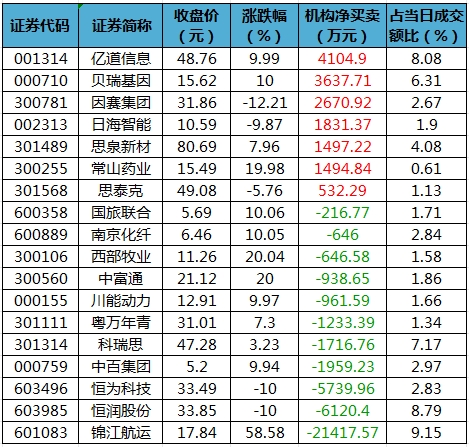 盘后龙虎榜数据显示,今日机构席位资金合计净卖出约2.58亿元。其中,净买入的个股7只,净卖出的个股11只。机构净买入最多的个股是亿道信息,净买入金额约4104.9万元;机构净买入居前的还有贝瑞基因、因赛集团等股。机构净卖出最多的股票是锦江航运,净卖出金额约2.14亿元;机构净卖出居前的还有恒润股份、恒为科技、中百集团等股。