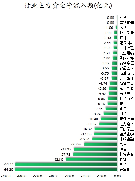 从行业板块来看,申万所属的31个一级行业,今日所有行业板块主力资金都呈现净流出,其中,计算机行业板块主力资金净流出最多,净流出金额为64.2亿元;行业板块主力资金净流出靠前的还有电子、传媒、机械设备、通信、汽车、非银金融,净流出金额分别为64.14亿元、32.3亿元、27.75亿元、27.25亿元、20.86亿元、15.74亿元。