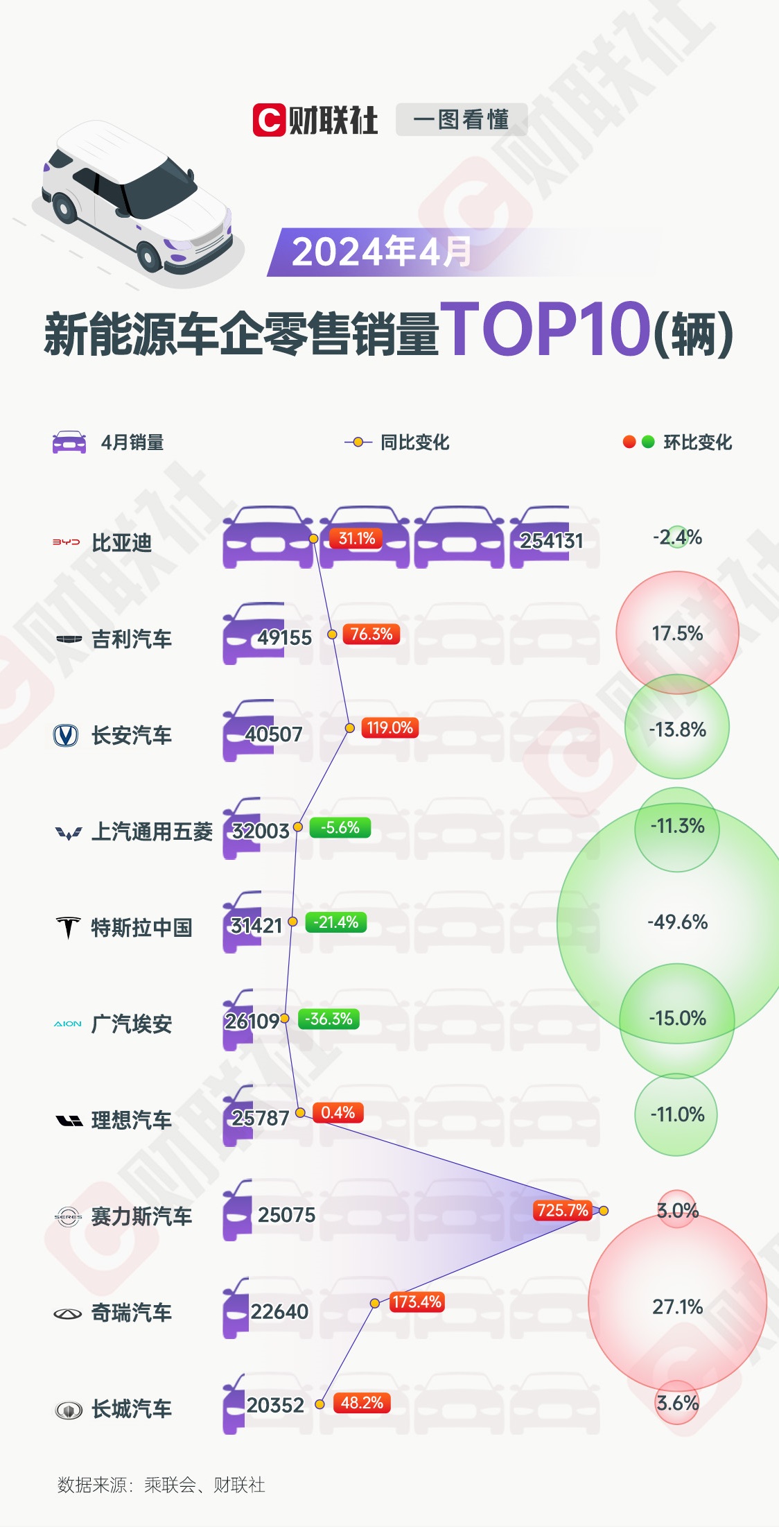 可以看到,虽然4月份国内新能源车企的零售销量环比有所下降,但同比增长依然显著,新能源汽车市场的整体增长态势依然强劲。