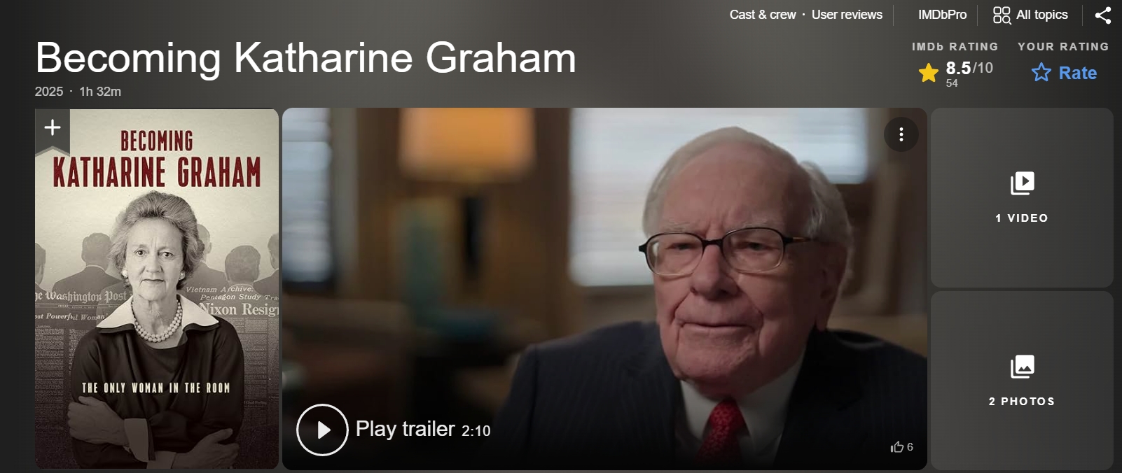 巴菲特向投资者推荐电影,是一部讲述《华盛顿邮报》出版人凯萨琳·格雷厄姆的纪录片《成为凯瑟琳·格雷厄姆》。巴菲特因与格雷厄姆的友谊及在《华盛顿邮报》董事会的角色而出现在这部影片中。在格雷厄姆执掌期间,这份报纸报道了水门事件,最终导致总统理查德·尼克松辞职。