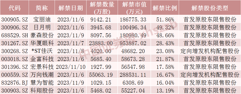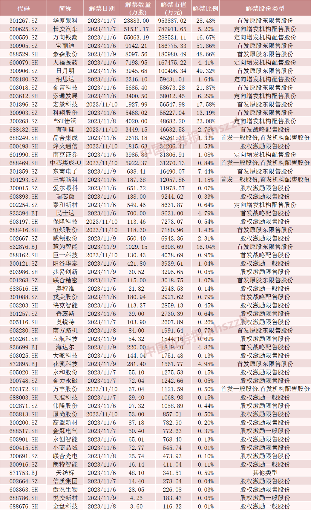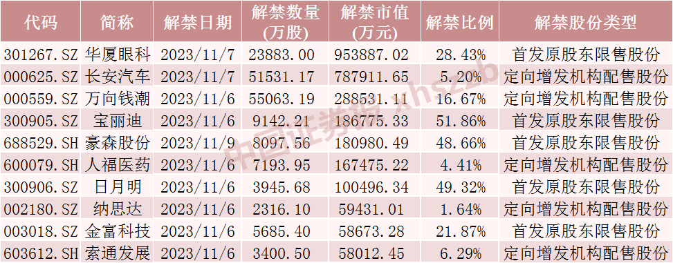 具体来看,Wind数据显示,华厦眼科11月7日将解禁2.39亿股,均为首发原股东限售股份。长安汽车11月7日将解禁5.15亿股,均为定向增发机构配售股份。万向钱潮11月6日将解禁5.51亿股,均为定向增发机构配售股份。