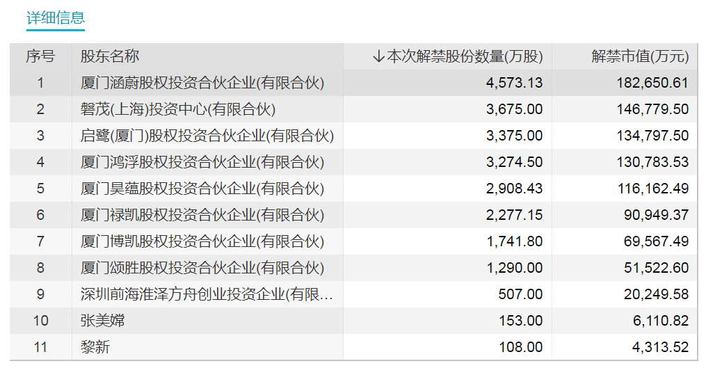 具体来看,在下周面临解禁的59只股票中,解禁市值最大的为华厦眼科,解禁股东为厦门涵蔚股权投资合伙企业(有限合伙)、磐茂(上海)投资中心(有限合伙)、启鹭(厦门)股权投资合伙企业(有限合伙)等11个股东,其中厦门涵蔚股权投资合伙企业(有限合伙)为华厦眼科第三大股东。