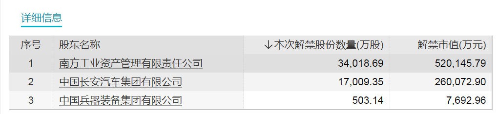 解禁市值第二大的是长安汽车,解禁股东为南方工业资产管理有限责任公司、中国长安汽车集团有限公司、中国兵器装备集团有限公司,这些股东下周解禁的股份来自于长安汽车2020年10月完成的定增,彼时的定增发行价为10.70元/股。