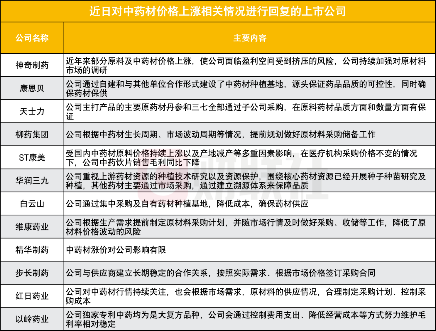 “中药茅”片仔癀今年5月将旗下主导产品片仔癀锭剂国内市场零售价从590元/粒上调至760元/粒,29%的提价幅度为历史最大调价幅度。公司方面表示提价由于主要原料及人工成本上涨等。近两个月内,神奇制药、康恩贝、天士力、柳药集团、ST康美、华润三九、白云山、维康药业、精华制药、步长制药、红日药业、以岭药业等多家中药上市公司在互动平台回复对于中药材价格上涨影响下的业务情况或应对措施。