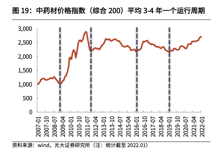 根据光大证券研报中统计数据显示,中药材价格指数(综合200)平均3-4年一个运行周期。然而,当前中药材的价格走势在业内看来却一反常态。有分析师指出,本轮周期已在高位运行了足足三年。更有从事中药销售的人士直言,二十多年,自己从未遇到过这么大涨幅。