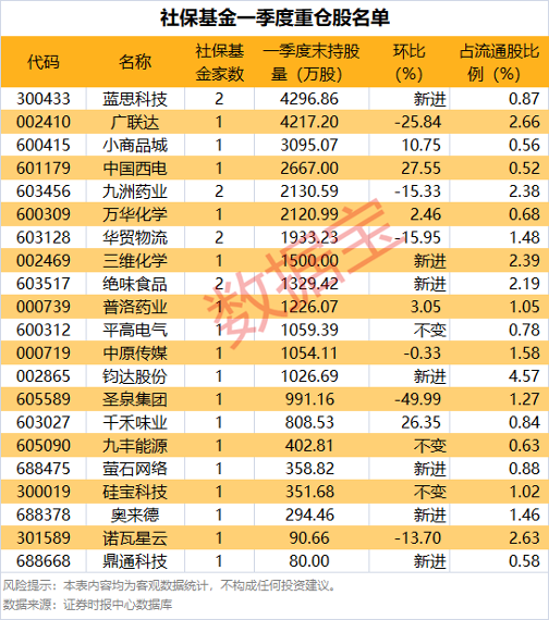 一季度社保基金持仓变动:新建仓7股,增持5股
