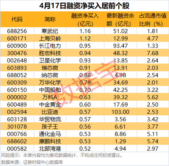 具体到个股,4月17日获融资净买入千万元以上的有181只,其中17股融资净买入额超5000万元。
