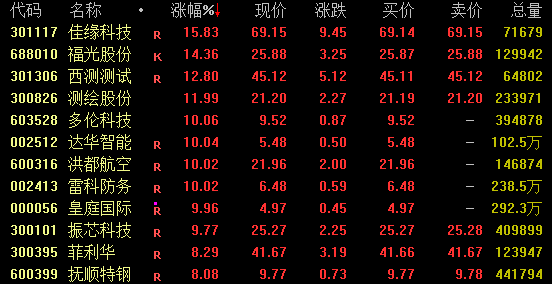 军工板块盘中震荡走高,截至收盘,佳缘科技涨近16%,福光股份、西测测试、测绘股份等涨超10%,多伦科技、达华智能、洪都航空、雷科防务、皇庭国际等涨停,振芯科技涨逾9%。