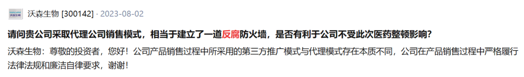 沃森生物表示,公司产品销售过程中所采用的第三方推广模式与代理模式存在本质不同,公司在产品销售过程中严格履行法律法规和廉洁自律要求。