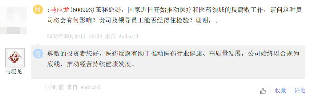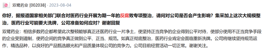 受各类消息影响,投资者坐不住了。他们纷纷在投资平台向医药行业公司发问:“医药反腐对公司到底有什么影响?”“公司及领导员工是否经得住检验?”