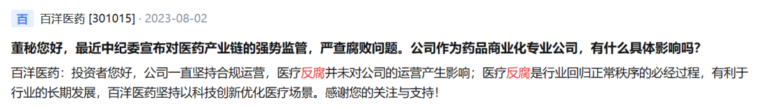 百洋医药表示,公司一直坚持合规运营,医疗反腐并未对公司的运营产生影响;医疗反腐是行业回归正常秩序的必经过程,有利于行业的长期发展,百洋医药坚持以科技创新优化医疗场景。