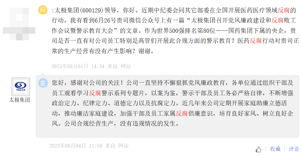 太极集团回复称,公司一直坚持不懈狠抓党风廉政教育,各单位通过组织干部及员工观看学习反腐警示系列专题片,以案为鉴,警示干部及员工务必严格自律,不断增强政治定力、纪律定力、道德定力以及抗腐定力。近几年来公司定期开展家庭助廉立德活动,推动廉洁家庭建设,加强干部及员工家属反腐倡廉意识,培育良好家风、树立良好企风。公司合规经营生产,没有违规情况的发生。