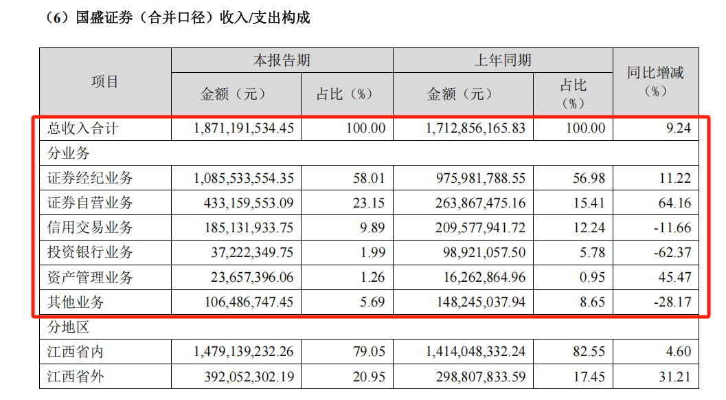 国盛金控证券业务运营实体为全资子公司国盛证券及其下属企业国盛期货、国盛资管、国盛弘远。合并口径来看,国盛证券2024年总收入合计18.71亿元,同比增9.24%;经纪业务收入为10.86亿元,同比增11.22%;自营业务收入为4.33亿元,同比增64.16%;信用交易业务收入为1.85亿元,同比下滑11.66%;投行业务收入为0.37亿元,同比下滑62.37%;资管业务收入为0.24亿元,同比增45.47%;其他业务收入为1.06亿元,同比下滑28.17%。