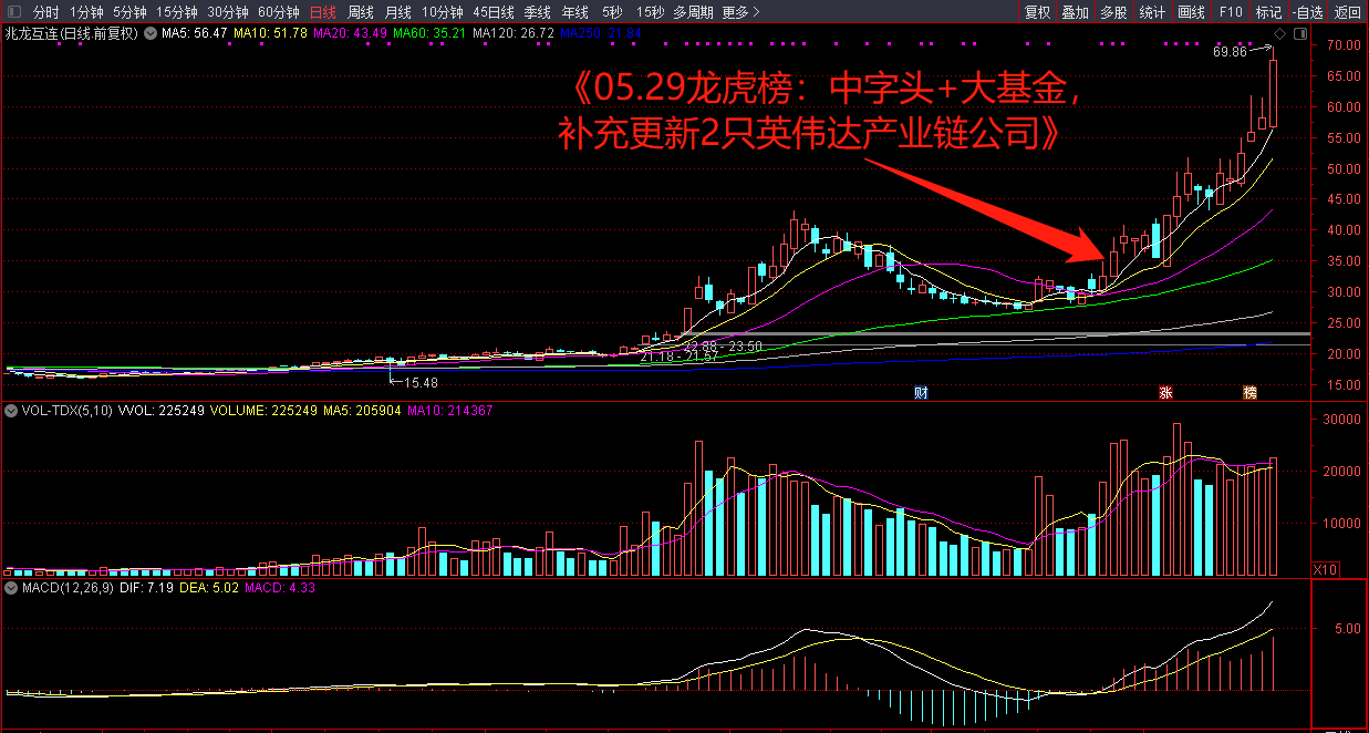 2)和浪潮信息深度绑定的兆龙互连,盘中20cm涨停续创历史新高,该股的逻辑我们在5月29日文章《05.29龙虎榜:中字头+大基金,补充更新2只英伟达产业链公司》也解析过。