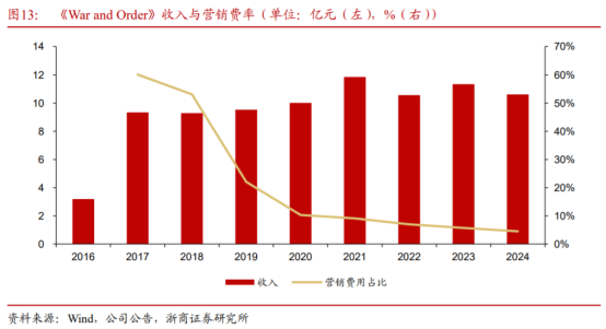 《War and Order》2016 年上线以来,年收入从 3.2 亿元爬坡,后逐年增加到 2023 年的 11.4 亿元,且从 2017 年开始就在 10 亿元的高位保持稳定,同样地,营销费用占比逐年降低。