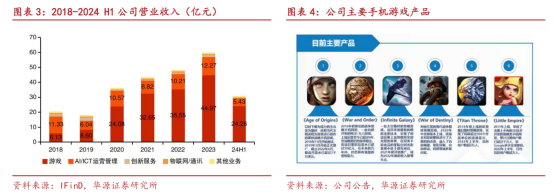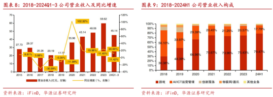 双轮驱动业务增长,推动营收强劲提升。自2020年以来,公司营业收入持续保持强劲增长。2020年,公司推出新游戏《Age of Origins》,同时公司将游戏收入核算方法由净额法调整为全额法,使得当年营业收入同比增长达到102.32%。之后,公司两款核心游戏产品《Age of Origins》和《War and Order》表现出色,加之计算机业务的持续优化,带动了整体营收的稳定增长。公司在2021年、2022年和2023年的营业收入同比增速分别为19.98%、11.40%和24.06%,24年前三季度同比增速亦达11.42%。此外,公司游戏业务的收入占比从2018年的30.38%提升至2024年H1的79.47%,已成为公司收入增长的核心驱动力。