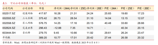 公司2024年归母净利润14.28亿元,扣除与大唐微电子和解后转回的坏账准备2.45亿元(24Q3发生,因此25Q3公司归母净利润或同比下滑)等,公司2024年扣非归母净利润11.47亿元。公司2025-2026年存量游戏存在自然衰减的可能,但AI业务的起量或弥补相应衰减,判断2025-2026年不含新游的利润基数约12亿元。预计两款“SLG+X”游戏如一款推广成功,则有望获得利润增量约7.7亿元,对应2026年公司归母净利润近20亿元。