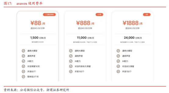 公司前期的积累在7月底迎来新的收获:公司推出avavox: AI Voice Agent VOX。avavox名称直观体现其AI语音的核心定位,达到只需动嘴,30 秒搭建语音营销机器人,大幅降低使用门槛。avavox采用按需计费,每 10 秒计费一次,如下图所示,有不同的套餐可供选择。