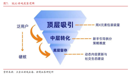 “SLG+X”品类更受追捧,成为“皇冠上的明珠”。当前时间点,SLG 手游面临用户群体固化和同质化严重的问题,“SLG+X”模式应运而生。“X”即“缝合”进其他各类玩法可以大幅提高获客面,平缓的学习曲线,提高留存,中后期再通过 SLG 玩法提炼用户价值,实现长期付费。
